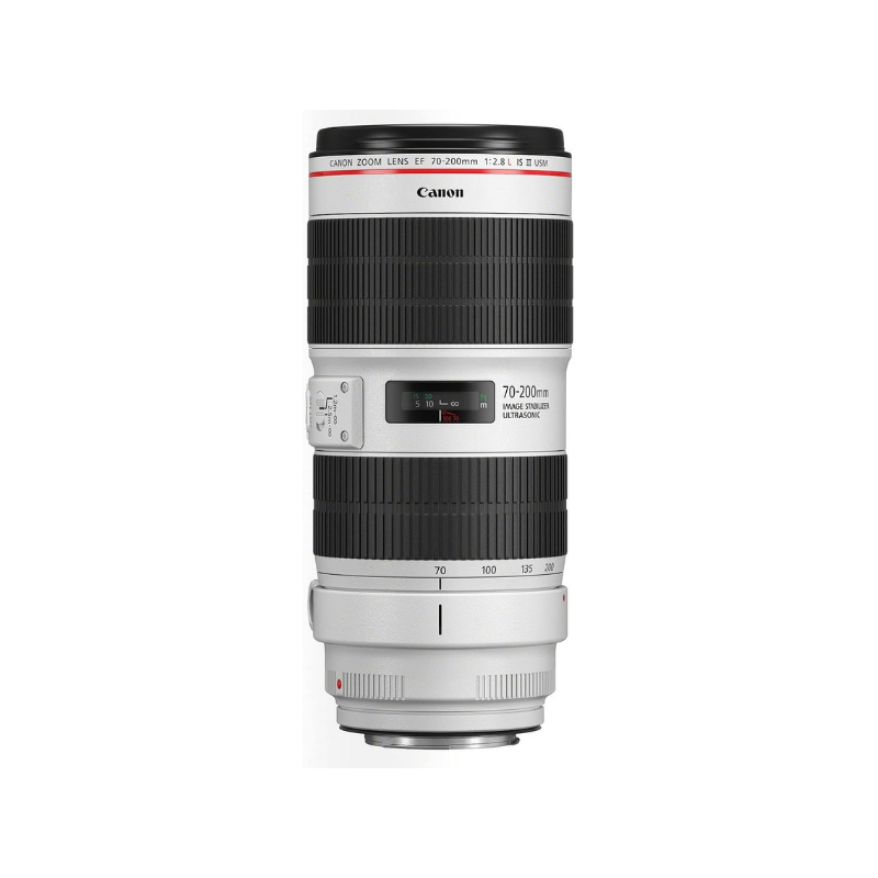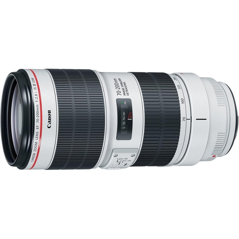El Canon EF 70–200mm f/2.8L IS III USM ofrece una longitud focal de 70–200 mm con una apertura máxima de f/2.8, ideal para obtener un excelente control de la profundidad de campo y un rendimiento superior en condiciones de poca luz. Su construcción óptica está compuesta por 23 elementos organizados en 19 grupos, lo que garantiza una alta calidad de imagen y una reproducción fiel de los detalles.