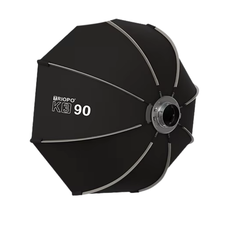 El Softbox Triopo Serie K3 de 90 cm ofrece una iluminación suave, uniforme y envolvente, ideal para retratos, moda, productos y grabaciones en estudio. Su forma octagonal ayuda a crear reflejos naturales y una luz más amplia y difusa. Gracias a su sistema de apertura rápida tipo paraguas, se puede montar y desmontar en segundos, facilitando su uso en sesiones tanto en estudio como en exteriores. Su interior plateado maximiza la reflexión de la luz, y su montura Bowens lo hace compatible con una gran variedad de flashes y luces LED.