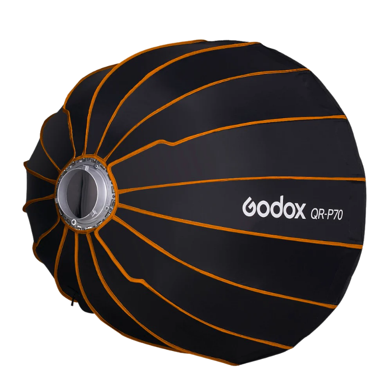 El Parabólico Godox QR-P70 de 70 cm ofrece una iluminación potente, suave y direccional, ideal para retratos, moda y grabaciones en estudio. Su diseño parabólico profundo proporciona un mayor control sobre la dirección y la difusión de la luz, logrando un efecto más concentrado y con transiciones suaves de sombras. Gracias a su sistema de apertura rápida tipo paraguas, se arma y desmonta fácilmente, siendo práctico para sesiones tanto en estudio como en exteriores. Su interior plateado reflectante maximiza la eficiencia lumínica y su montura Bowens lo hace compatible con una amplia gama de luces y flashes profesionales.