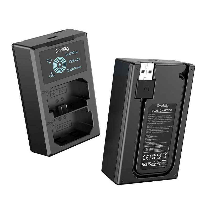 El Kit SmallRig NP-FZ100 incluye dos baterías recargables de ion de litio y un cargador dual inteligente, pensado para cámaras Sony que utilizan este modelo de batería. Ofrece mayor autonomía y eficiencia energética, ideal para sesiones de fotografía o video prolongadas. El cargador permite alimentar ambas baterías simultáneamente e incorpora entradas USB-C y Micro USB, junto con indicadores LED que muestran el estado de carga en tiempo real.